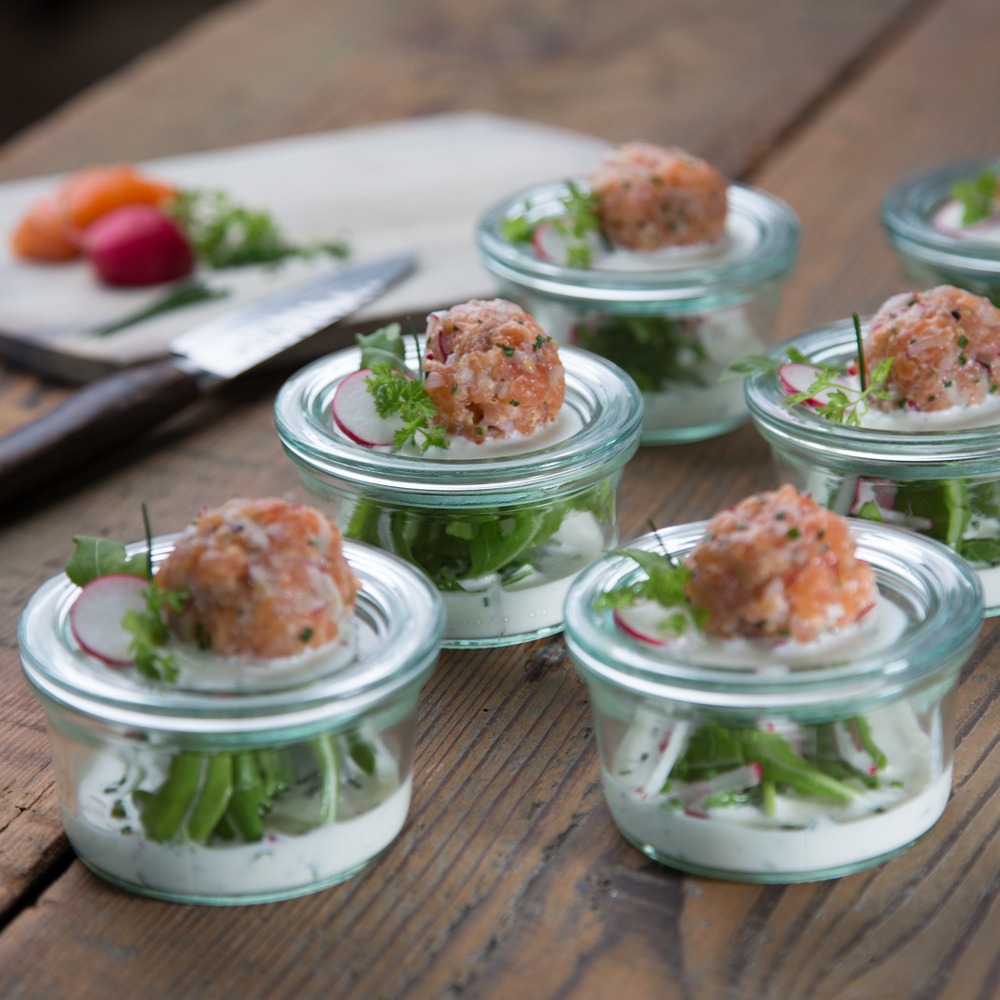 Feinstes Fisch-Fingerfood! Schnell angerichtet, noch schneller wieder verschwunden. Dieses exquisite Lachsrezept stammt von der Tafelkünstler Kochschule Steffi Metz Cooking. Und mit der Wahl der Kräuter verleihst du der ihm sogar noch eine persönliche Note.