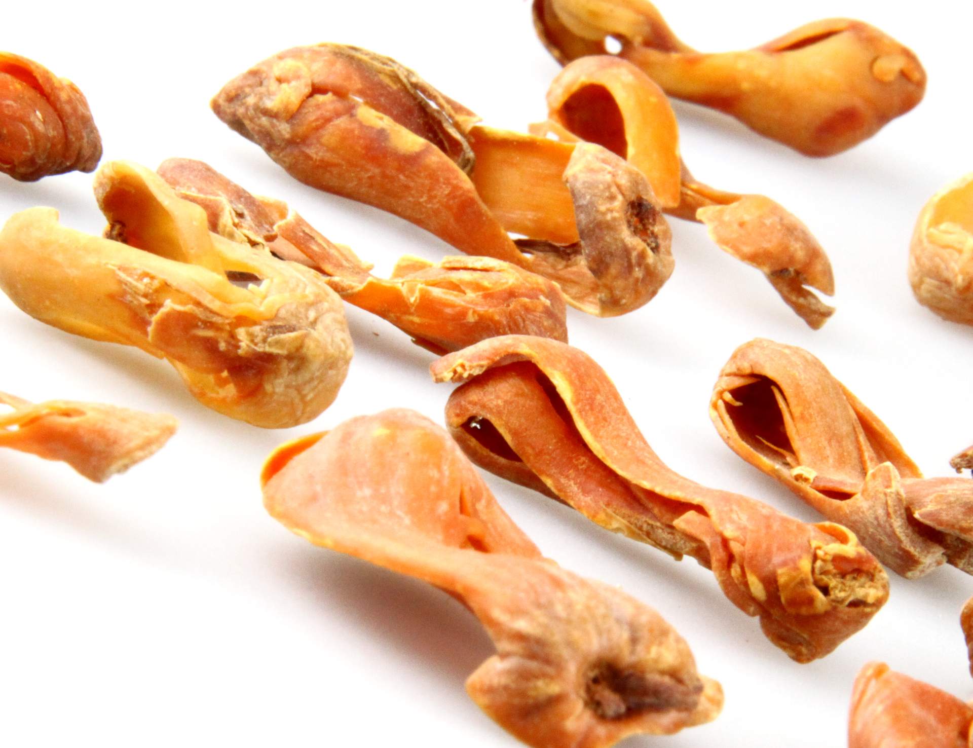 Gewinnung: Der ziegelrote Samenmantel, der den Samen der Muskatfrucht, die sogenannte Muskatnuss, umgibt, wird möglichst ohne zerreißen abgezogen und ca. 8 Monate nachgetrocknet.