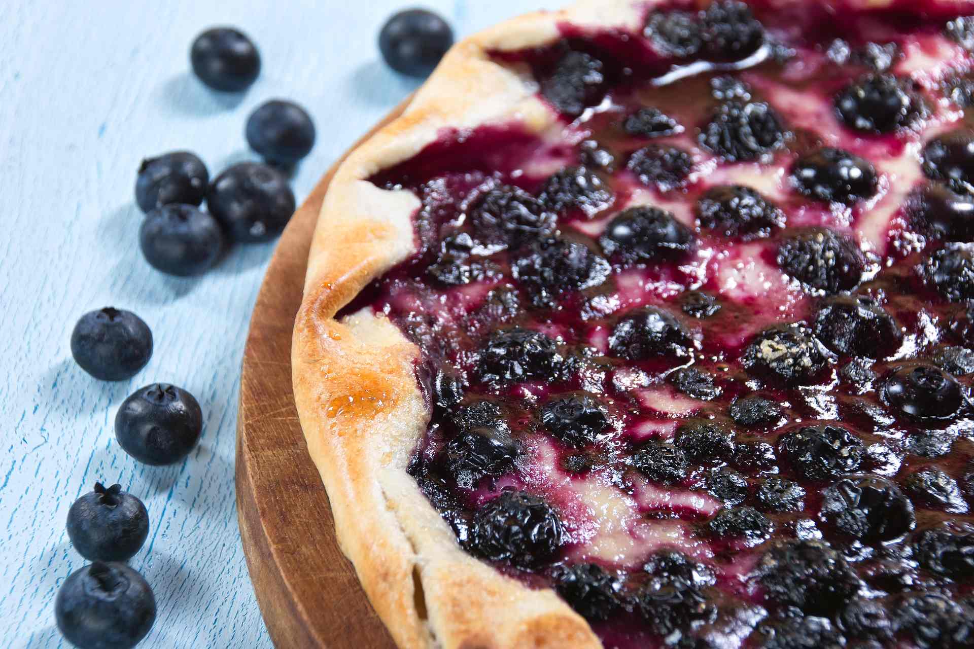 Blaubeermischung von der Kochstelle nehmen, Zitronensaft und restliche Butter einrühren. Nachdem die Butter vollständig geschmolzen ist, restliche Beeren untermischen und auf dem Tortenboden verteilen.