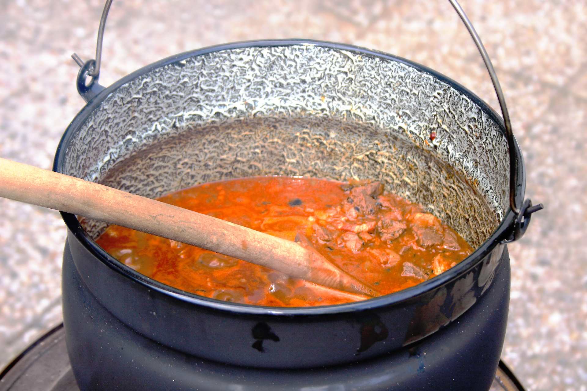 Zwiebeln schälen und würfeln, Karotten würfeln. Das Kalbsfleisch mit einem Kochmesser in etwa 1 cm große Würfel schneiden und zusammen mit den gewürfelten Zwiebeln und Karotten in einem großen Topf mit Olivenöl scharf anbraten. Knoblauch schälen und fein hacken. Chili klein schneiden. Kreuzkümmel, Knoblauch und Chilis dazugeben und ebenfalls mit anbraten. Anschließend mit Salz, Pfeffer aus der Mühle und Paprika gut würzen.